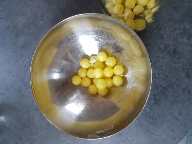 - 1 Tüte Zitronenbonbons ( ca. 99 Cent und 200 Gramm)